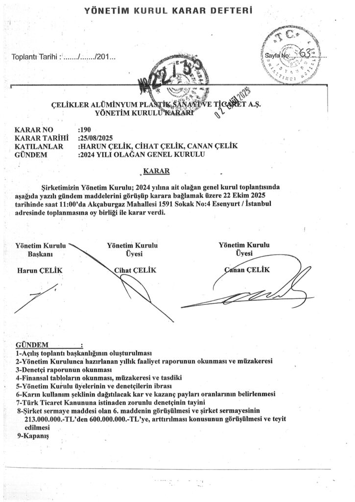 Çelikler Alüminyum 2025 190 Nolu Yönetim Kurulu Kararı