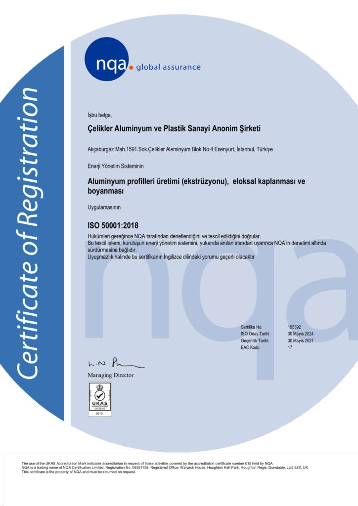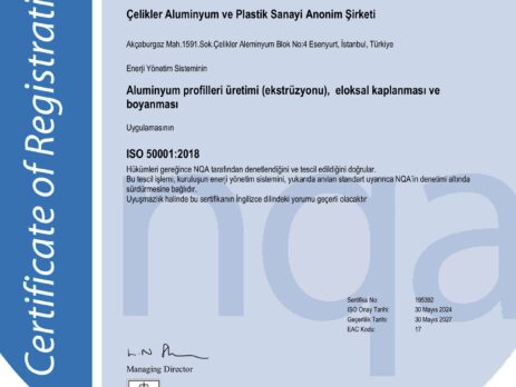 Çelikler Alüminyum, ISO 50001:2018 Enerji Yönetim Sistemi belgesini aldı.